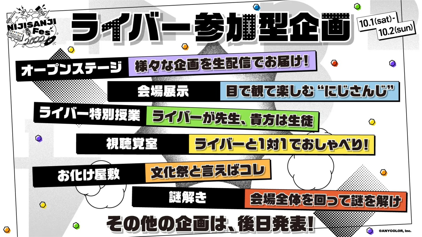 「彩虹社 FES 2022」是彩虹社成立以來最大的活動,參加的 Vtuber 包含日本、EN 組以及 4 月合併到本家的 KR 和 ID,總人數超過 100 多名,將以文化祭為活動主題,推出各種舞台活動、食品攤位與周邊販售等多采多姿的內容。