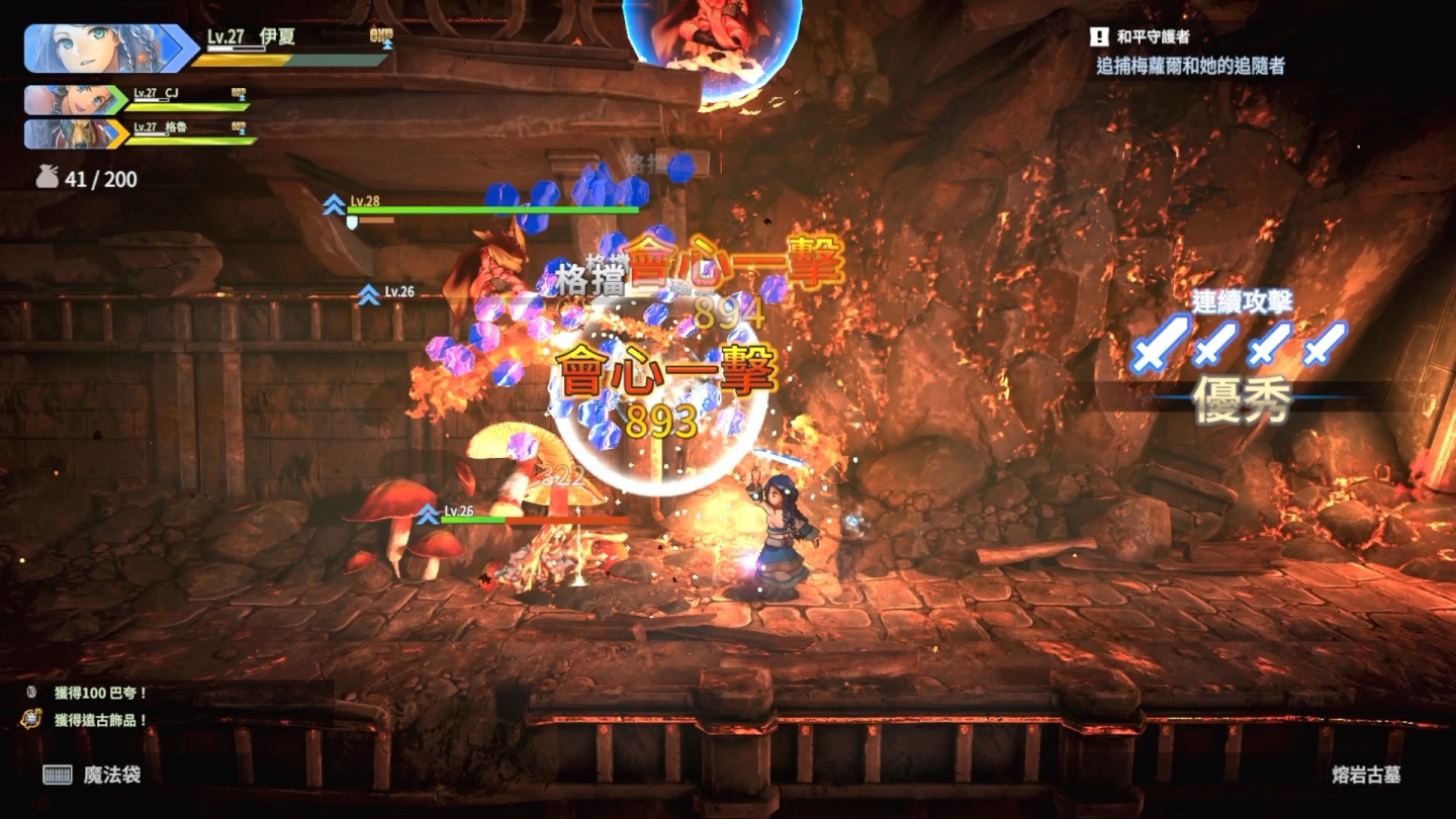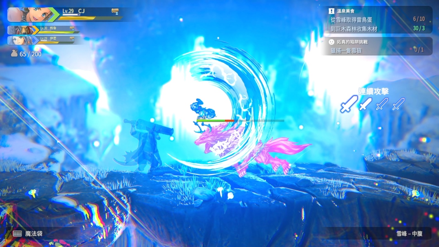 不過解完這些支線的回饋性還是相當高,你所擁有的集章卡隨著集滿會升級,小鎮的音樂與氣氛也會有所變化,當跨越冗長的作業性支線考驗後,玩家在戰鬥時的動作性則是充分體現了本作以橫向捲軸為主要玩法的特性,可以隨意切換三個人進行戰鬥以外,每個角色都可以透過升級提昇他們的戰鬥連擊次數以及攻擊手勢,透過連攜系統,會逐步解放遊戲在戰鬥上的爽快程度,還有屬性符文相剋的設計,角色的能力可以讓你在土、冰、火、雷之間切換使用,並且也具有攻防上的策略考量。