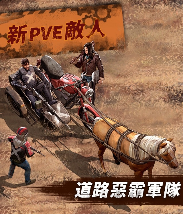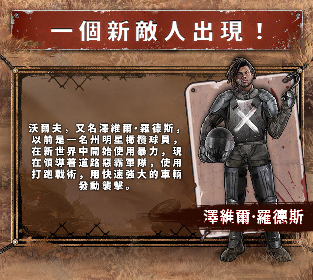 前知名橄欖球運動員澤維爾.羅德斯,也有人叫他沃爾夫,他透過暴力行為進行統治,在末世降臨後就領導著道路惡霸軍隊進行襲擊,讓世界的秩序更加混亂黑暗。玩家們將一路收復他佔領的據點,獲得更多資源重新建立良好的社會秩序。道路惡霸軍隊也將在玩家探索世界的過程中現身,透過眾人團結的力量擊退這些新敵人,以獲取更多資源與獎勵。
