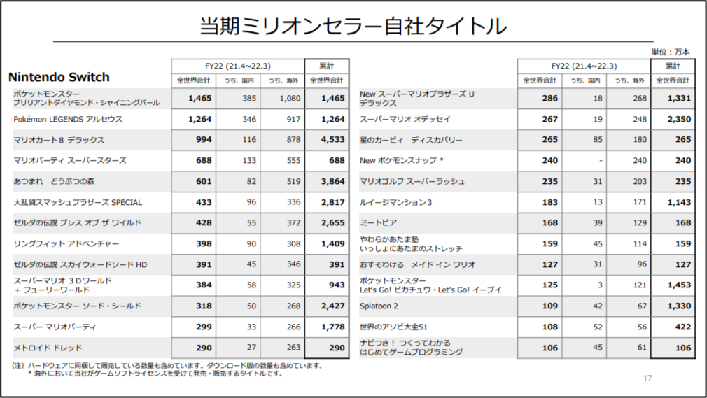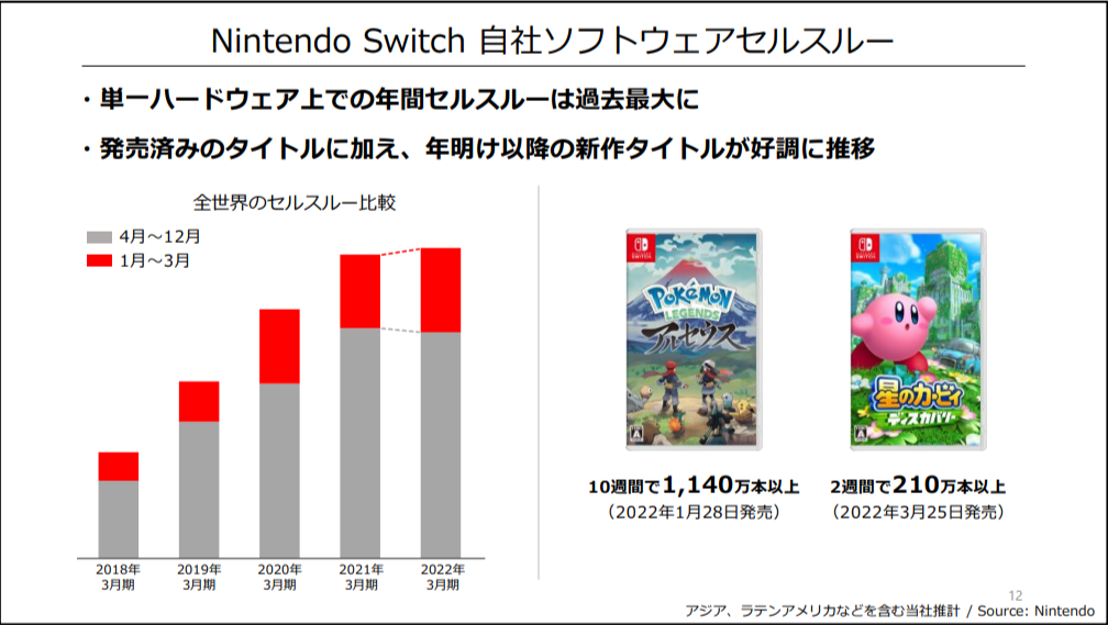 本年度全年遊戲軟體出貨量創下歷年最高記錄,實際上在第四季度(2022 年 1 月至 3 月)也因為和往年不同有兩款重量級作品的關係,所以創下歷年最高的第四季度遊戲軟體銷售量,《寶可夢傳說 阿爾宙斯》在發售十週內實際銷售量達 1140 萬套以上,而系列首次嘗試 3D 化的《星之卡比 探索發現(星のカービィ ディスカバリー)》也在發售兩週內就創下實際銷售 210 萬套的系列最高記錄。