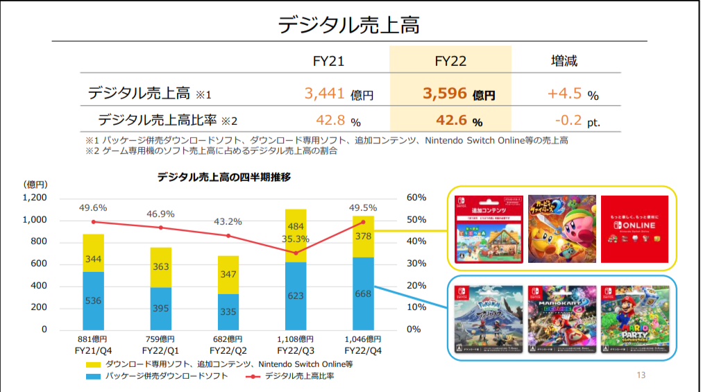 由於《瑪利歐賽車 8 豪華版(マリオカート8 デラックス)》追加下載內容「新增賽道通行證」推出,加上併入高階版會員服務 「Nintendo Switch Online+追加包」提供內容,在疫情紅利過去後一度趨緩的數位銷售額比率,在第四季度又再次衝高到接近 50% 。