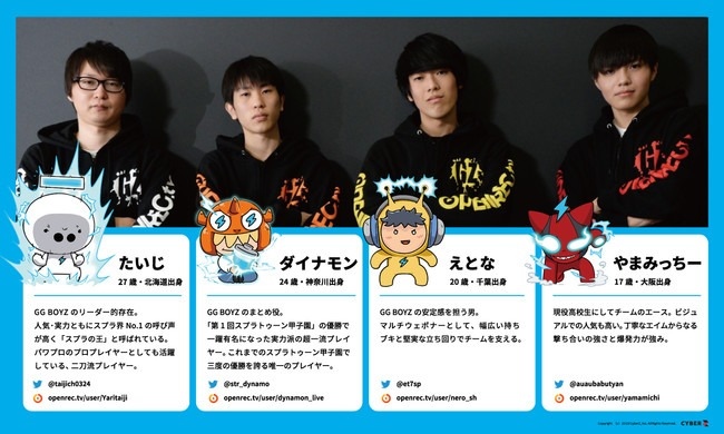 GG BOYZ 是在 2017 年由「たいじ」、「ダイナモン」、「えとな」與「やまみっちー」四人組成的團體,以《Splatoon 2》的遊戲實況和投稿影片而聞名,並且在 2018 與 2019 年舉辦的「Splatoon 甲子園」比賽中拿下全國二連霸,也曾經作為日本代表參加世界大賽;在 2019 年 11 月的時候,其中一名成員「やまみっちー」因為升學的關係宣布退出 GG BOYZ,該團體變成 3 人組合持續活動至今。