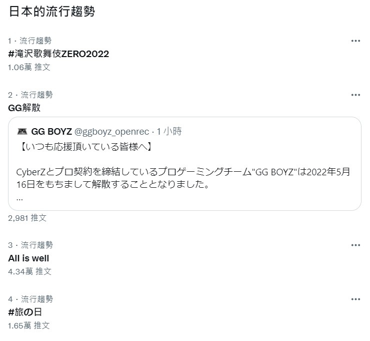 GG BOYZ 解散消息發布後立刻登上日本推特趨勢