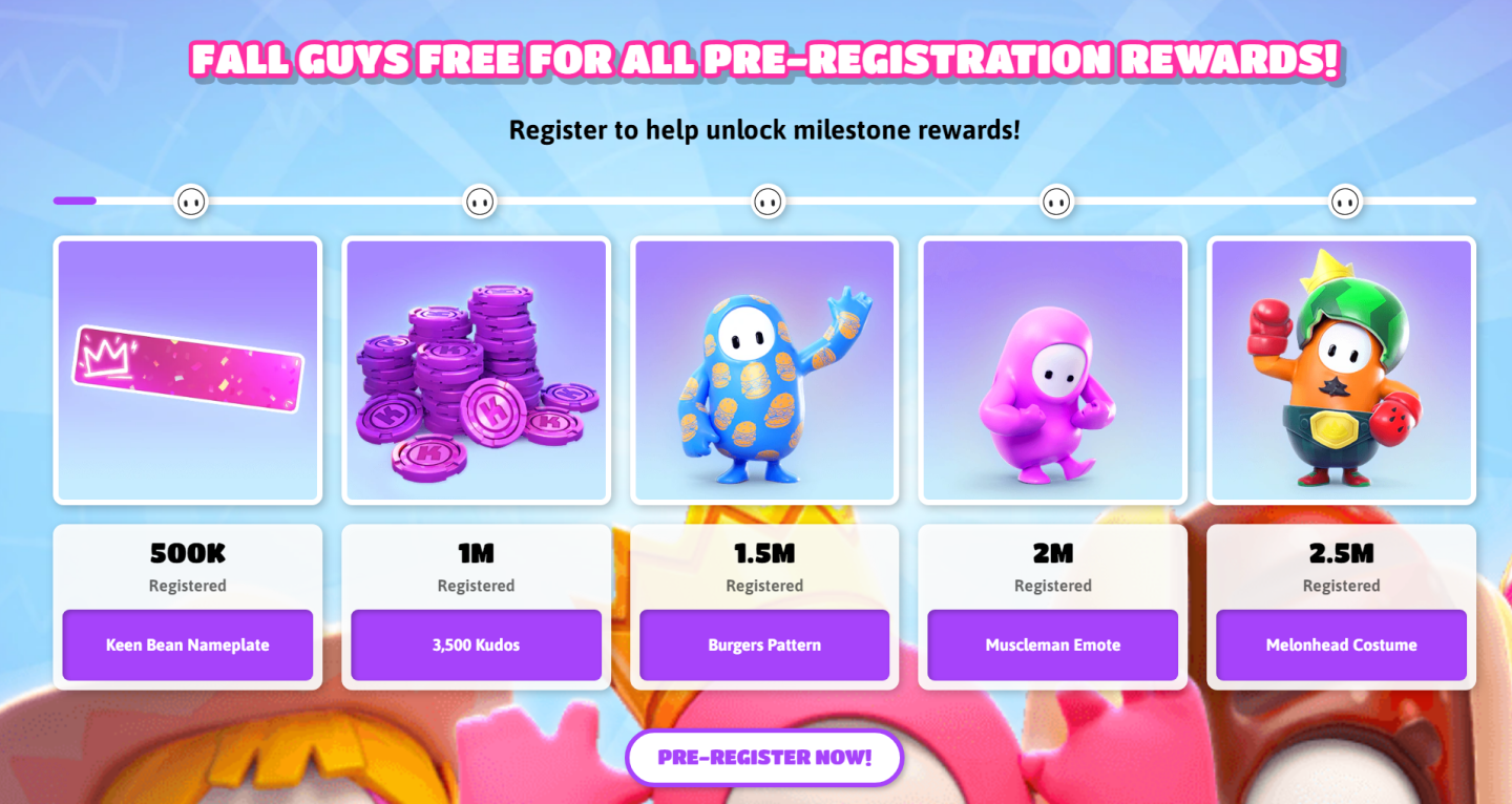 Epic Games Store 同時舉辦慶祝《糖豆人:終極淘汰賽》 預約登錄活動,根據參與預約活動的參與玩家人數,將逐步解鎖姓名牌、榮耀幣、漢堡花紋、展示肌肉表情動作、西瓜套裝等獎勵,將贈送給全平台遊戲玩家。
