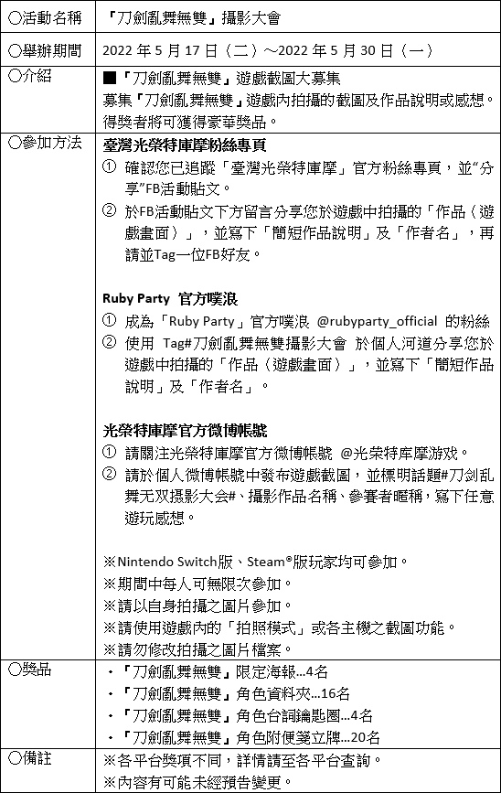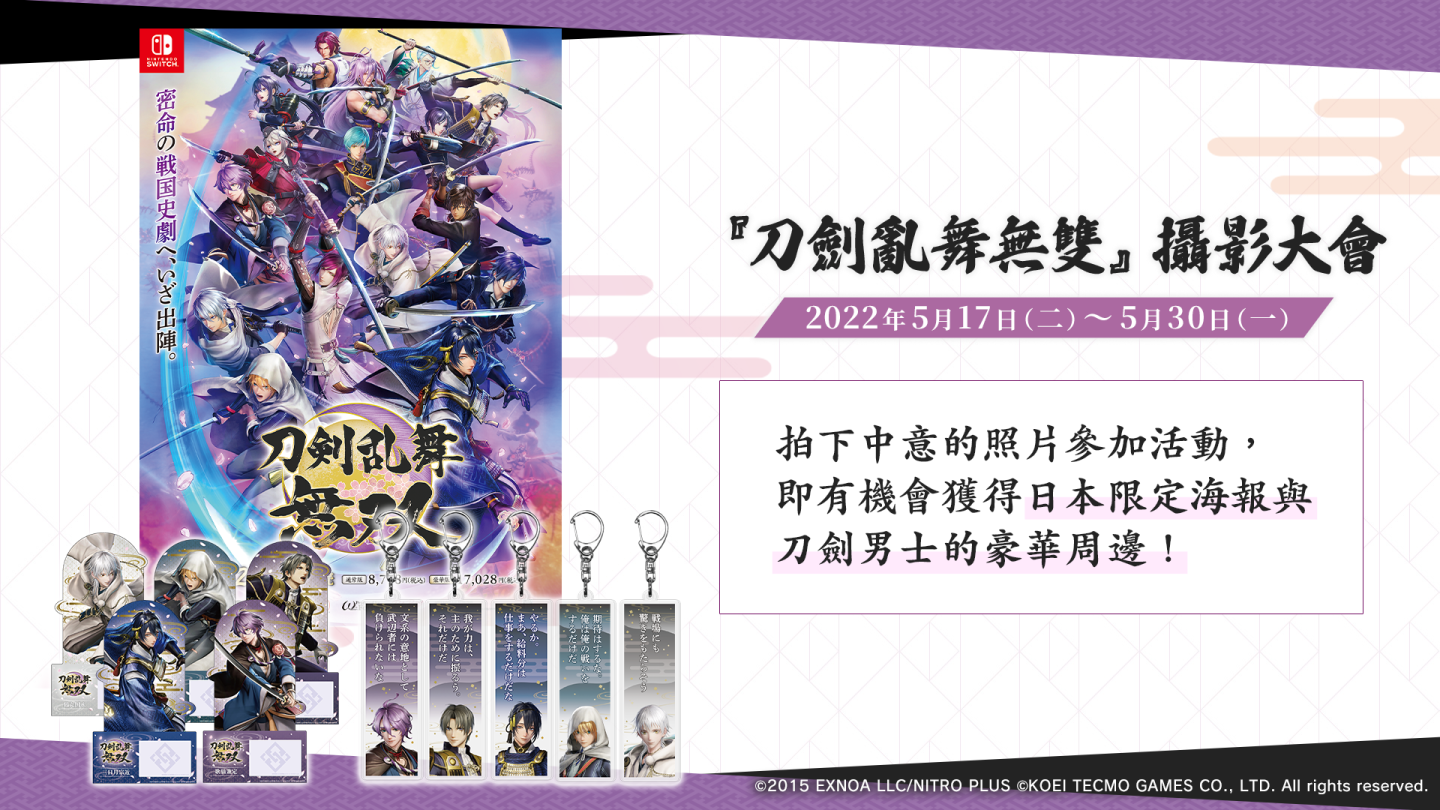 同時為了慶祝《刀劍亂舞無雙》Steam®版即將上市,「《刀劍亂舞無雙》攝影大會」也於今日開跑,將募集《刀劍亂舞無雙》遊戲內拍攝的截圖投稿。請將中意的照片按照指定方式投稿,活動結束後經嚴正抽選,得獎者將可獲得日本限定海報或刀劍男士的豪華周邊獎品。舉辦期間為 2022 年 5 月 17 日(二)至 5 月 30 日(一)。