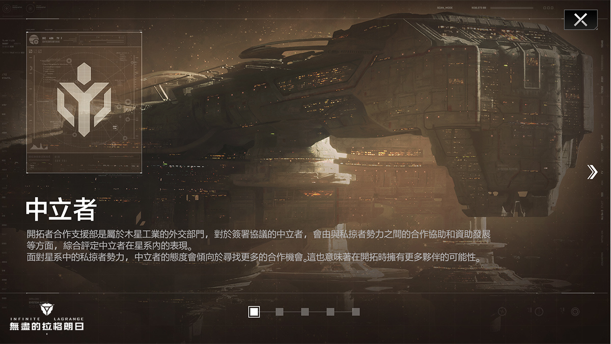 中立者協議由木星工業合作支援部提供,這個頂尖的船艦設計和製造公司希望通過開拓者們架起私掠者與星系勢力之間溝通的橋梁,成為拉格朗日銀河中獨特的「外交家」。