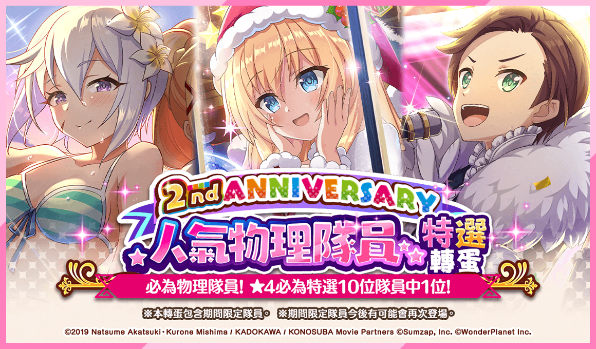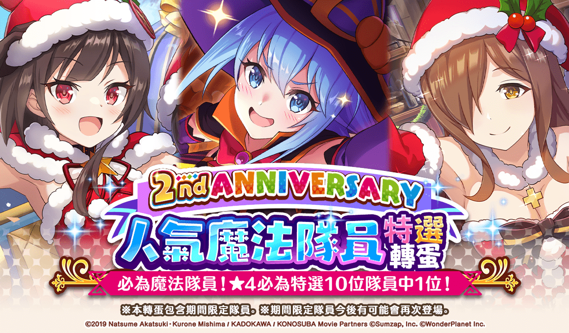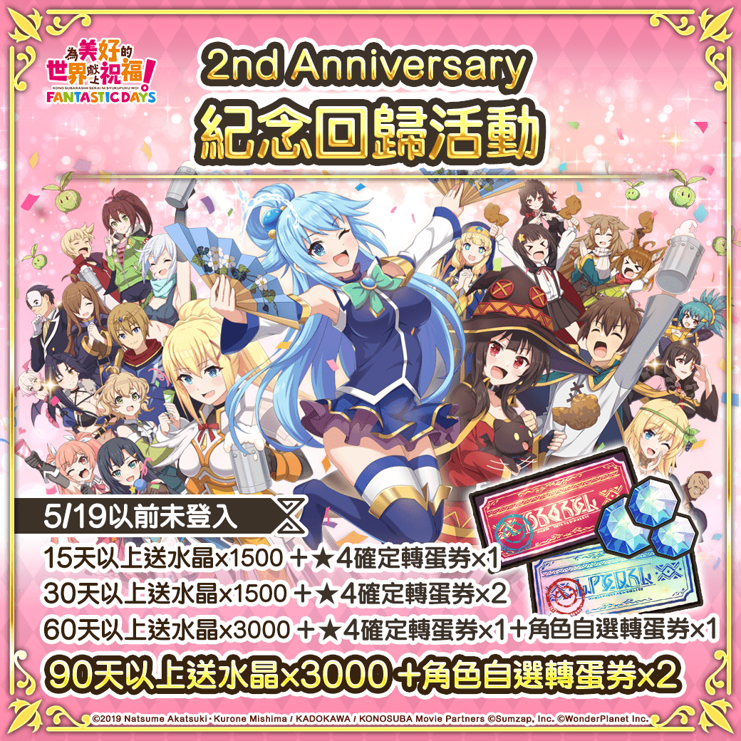 WonderPlanet Inc. 發行及營運,改編自人氣動畫《為美好的世界獻上祝福!》首款手機遊戲《為美好的世界獻上祝福!Fantastic Days》(以下簡稱《美好世界FD》),將於 5 月 19 日(四)起舉辦「2nd Anniversary前夜祭活動」。