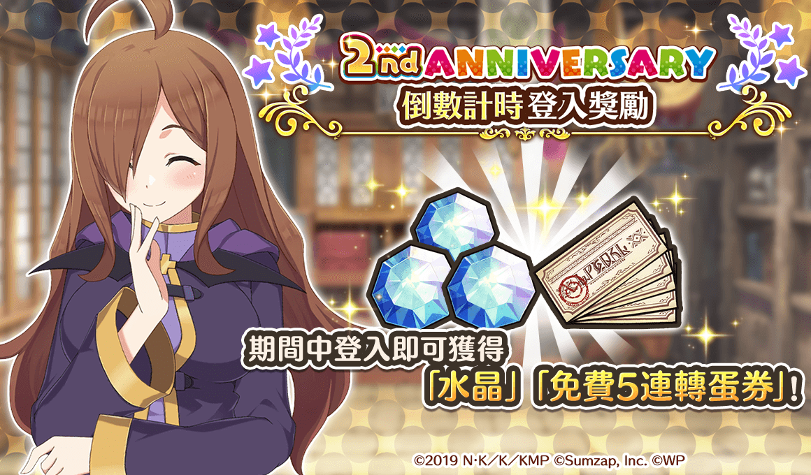 5 月 19 日(四)起,將舉辦「2nd Anniversary倒數計時登入獎勵」期間限定活動。期間內只要登入遊戲,就能夠免費獲得「水晶」和「免費 5 連轉蛋券」豪華登入獎勵。現在就開始每天登入遊戲領取獎勵吧!