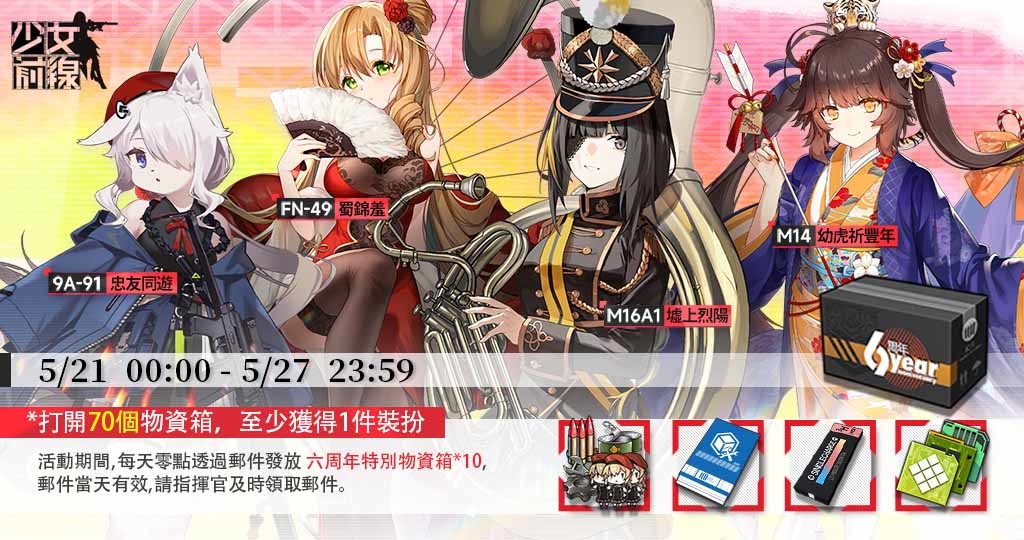 每日登入遊戲可獲取 10 個「6 周年特別物資箱」,打開「6 周年特別物資箱」將有機率獲取包含「9A-91-忠友同遊」、「FN-49-蜀錦羞」、「M16A1-墟上烈陽」、「M14-幼虎祈豐年」以上裝扮在內的豐厚物資補給獎勵!