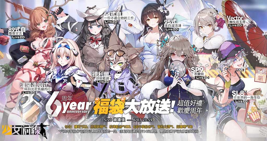 本次福袋內容包括:鑽石*520、原型妖精*1、校準點券*1000、6 周年裝扮券*1、誓約之證*1、採購幣*100。在活動介面使用【6 周年裝扮券】,將可獲得以下八件裝扮中的隨機一件,其中包括「64 式自-一份不適合她的工作」、「德利爾-郊狼藍調」、「SL8-在世界的一角等你」、「95 式-素白濯清漣」、「漢陽造 88 式-純白流星負願而行」、「89 式自-麋鹿宣言」、「Vector-攜枝踏玉塵」、「SP9-寒蘭傲」等。以上裝扮均搭載 Live2D 功能,每位指揮官僅限購買一次六周年福袋。