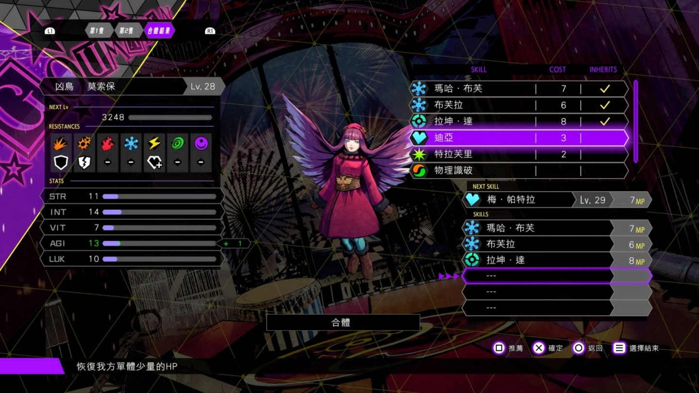 在六寶界的馬戲團・業魔殿可以進行惡魔合體,藉由惡魔合體能創造出全新的惡魔。可使用 2 隻惡魔進行 2 身合體,另有以特定惡魔為材料才能進行的特殊合體。也能以合體結果來設定多種條件篩選條件後再執行合體,當然也有能從可進行的搜尋合體或是目前持有的惡魔組合中,依據推薦的合體結果給予選擇提示的推薦合體。不論是想要仔細地進行合體或是想要快速地完成合體,都可以找到最適合自己創造仲魔的方法。