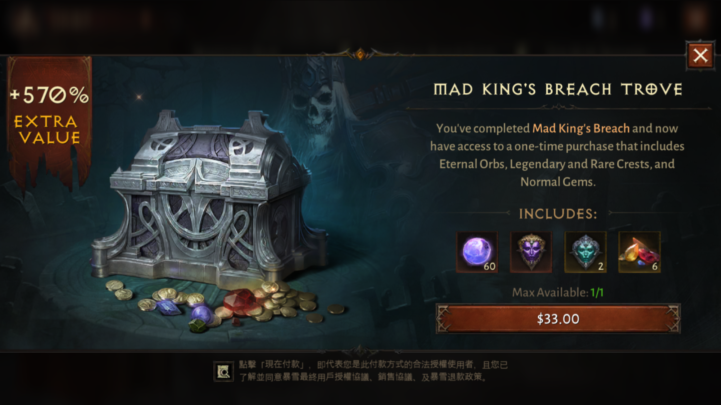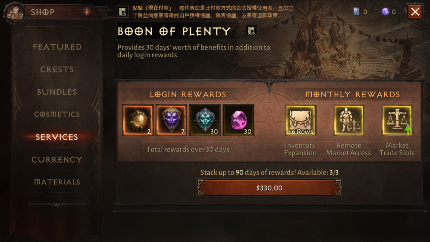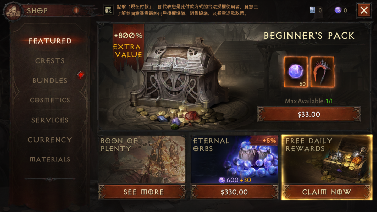 搶先體驗版無開放付費系統,但已能是先看商品項目,玩家登入七天有每日首殺獎勵,並固定可免費領取每日獎勵包。商店還有附贈武器與商城幣(永恆寶珠)的新手包,常見的首儲寶珠優惠項目,30 日戰鬥季票也屬於加值服務,可增加玩家包包格數、隨時打開拍賣場(販售寶石)等,最多可以買到累積 90 日,另外還能購買替遠古秘提供境額外獎勵的「傳奇徽章,以及各職業的造型服裝。雖說付費商品都不是強制性的,但基於「免費的最貴」的手遊生態,實際上是否需要小課甚至重課,就屬於玩家的選擇。
