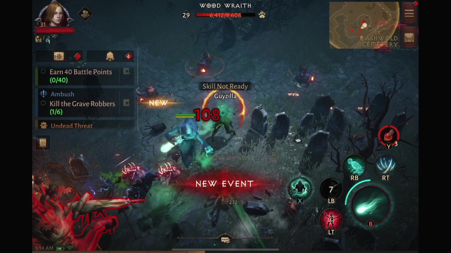 戰鬥技能隨等級解放技能格數,最終可以有四種可設定的技能,以及一般攻擊累積能量條的「絕招」狀態,採用時下虛擬搖桿的操作。並在技能鍵上有長壓、短壓、以及拖曳出技能方向的方式,除了需手動指向性技能大多都有自動追蹤的攻擊方式。戰鬥時虛擬搖桿操作依然無法跟接上藍芽控制器之後的體驗相比,唯一有優勢的大概就是在界面操作的順暢度。此外紅水的使用,隨撿拾紅血球有固定三次的使用,因此強迫戰鬥時對於危險的傷害還是得走位。