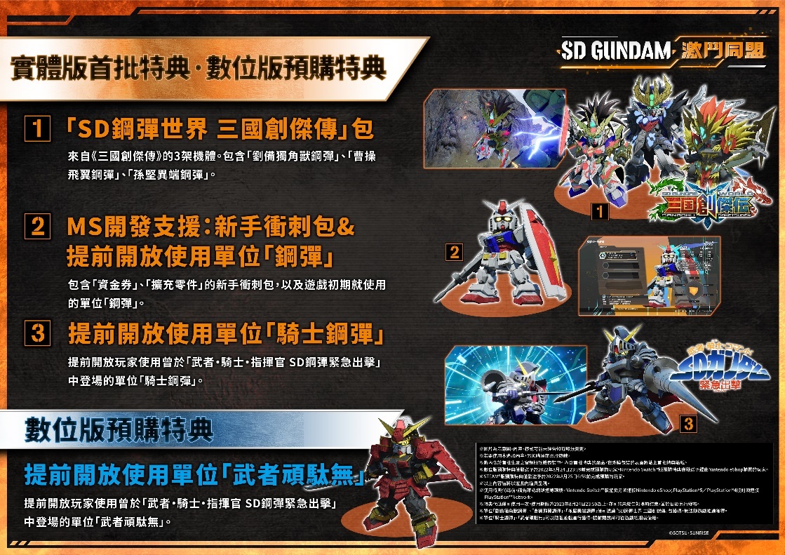 而隨著本次發售日決定,官方也宣布,將會針對實體包裝版.下載版推出「SD鋼彈世界 三國創傑傳」包(內含劉備獨角獸鋼彈」、曹操飛翼鋼彈、孫堅異端鋼彈等三隻機體與其他特典道具)、MS 開發支援「標準包」& MS 機體「鋼彈」先行解放權、機體「騎士鋼彈」先行解放權等三項特典作為早期購入特典;另外還會推出 MS 機體「武者頑駄無」先行解放權作為 DL 下載版專屬購入特典,玩家們屆時可別錯過。