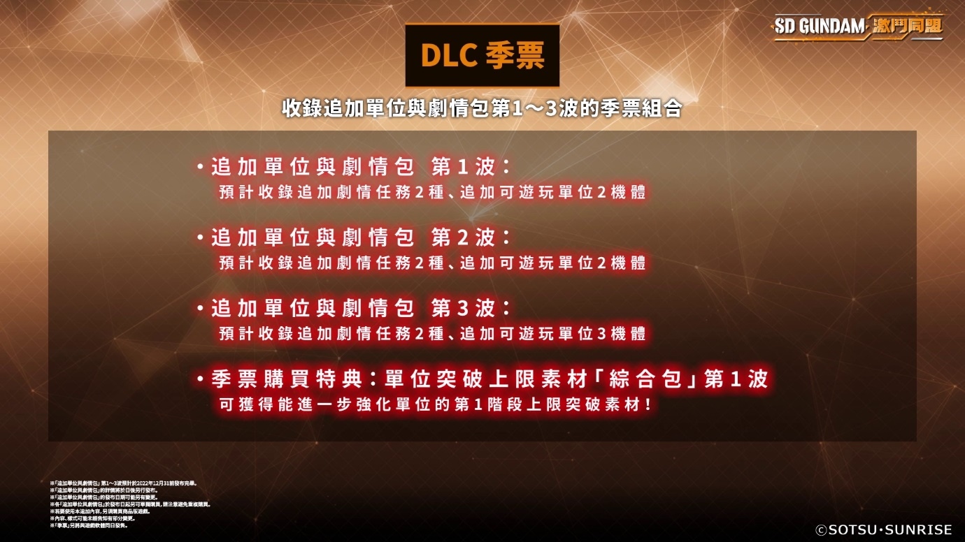 而隨著本作即將上市,官方當然也會推出豪華 DLC 季票讓玩家們選購。在季票中,預定將會推出三波的「機體&劇情包」(每次預計都會追加兩個劇情任務與兩隻玩家機體登場,第三次則是會變成追加三隻機體),玩家購買季票,還可以獲得機體限界突破素材包作為購入特典,讓玩家可以更快速強化自己的機體來攻略關卡挑戰強敵。