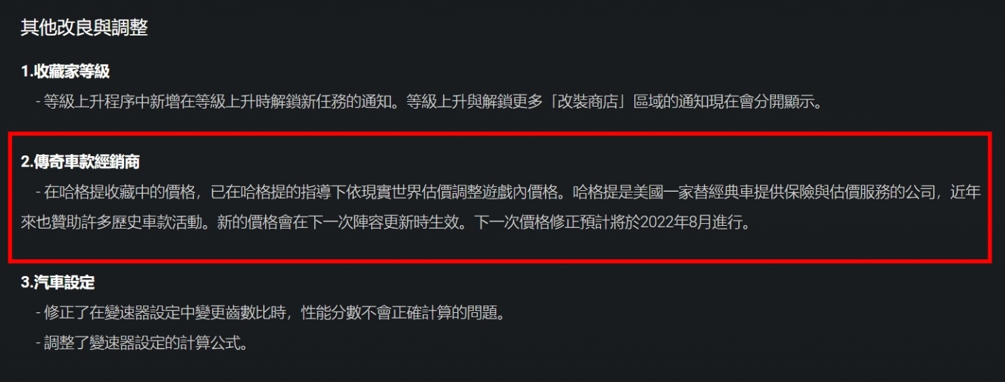 雖然遊戲上基於隨機的邀請函機制,傳奇車種無法直接查看車輛售價,發現調漲的是《跑車浪漫旅》玩家社群「GTPlanet」藉由資料挖掘的形式整理了價格清單,在更動的車輛中,最大的幅度如法拉利 F40 價格直接翻倍,而哈格提汽車的價格漲幅為 3.8 %,引起部份使用者不滿,根據官方對更新資訊 1.15 明示「 在哈格提收藏中的價格,已在哈格提的指導下依現實世界估價調整遊戲內價格。哈格提是美國一家替經典車提供保險與估價服務的公司,近年來也贊助許多歷史車款活動。新的價格會在下一次陣容更新時生效」被認為對遊戲是負面影響。