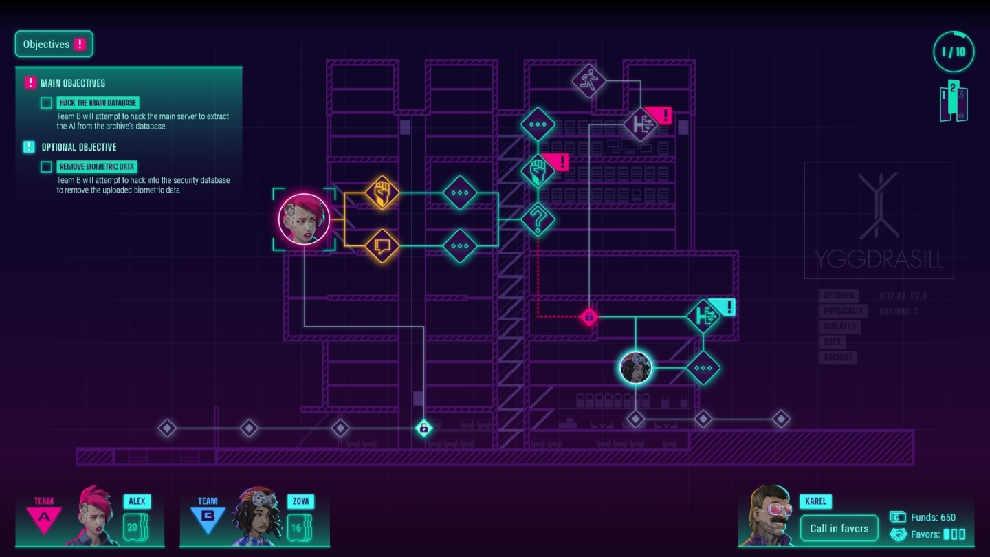 除了基於卡牌的戰鬥以外,同伴中有一名技術高超的駭客「Zoya」,想要入侵最安全的公司系統就得靠她,在虛擬空間中存在著獨特的卡牌謎題,只要成功破解並躲過程式與電腦病毒的攻擊,就能順利入侵伺服器獲得寶貴的資料,然而每個階段的設施結構都不同,玩家將面臨到分頭行動的抉擇,能否承擔風險做一票大的就看玩家的決定了。