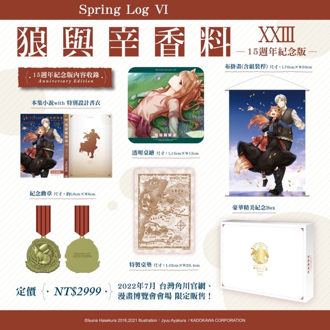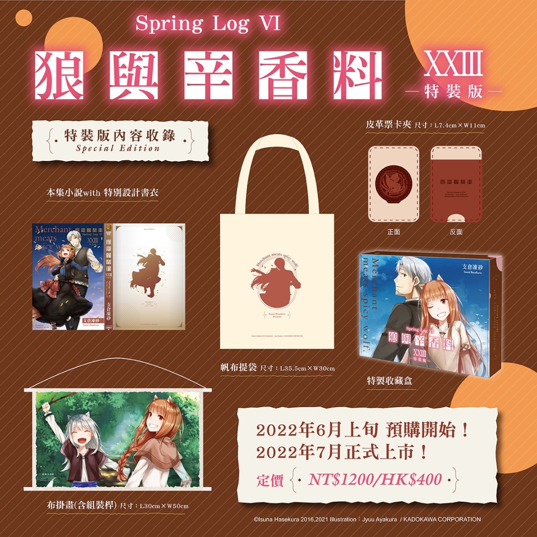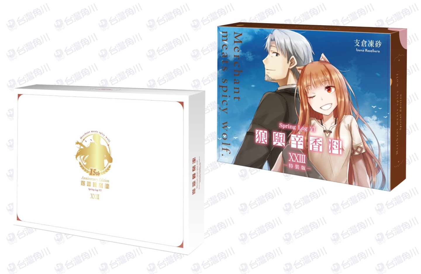 為慶祝《狼與辛香料》在台上市滿 15 週年,《狼與辛香料 (23)》特別推出豪華套組「15 週年紀念版」以絕美的高規格精裝藏書盒「豪華精美紀念 BOX」收錄羅倫斯與赫蘿共舞的珍貴畫面「布掛畫」、精緻織帶搭配超質感鋅合金特製的「紀念勳章」、充滿回憶的旅程地圖「特製桌墊」及「透明桌繪」完美展示賢狼赫蘿的可愛模樣;「特裝版」則是以超甜蜜兩人為主題設計「精美收藏BOX」,收錄赫蘿母女溫馨氛圍「布掛畫」、簡約有型的「皮革票卡夾」及印象風格「帆布提袋」。即日起開放特裝版事前預購至 6/16 (四),凡於台灣角川官網完成預購再加贈「台灣角川 2022 線上漫博」100 元優惠券乙張。更多特裝版預購相關資訊,請至官方網站查詢。