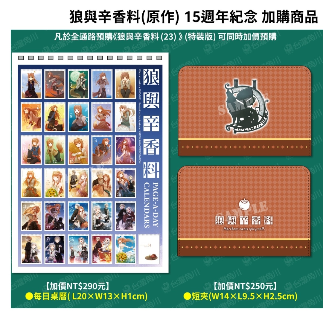 本次特別推出五款 15 週年紀念加購商品;收錄一整月滿滿 31 天美圖的「每日桌曆」及印象風格設計的「短夾」可在特裝版事前預購期間同步加價預購;而「電競滑鼠墊」及兩款「壓克力鑰匙圈」則限定於 2022 漫博會場加價購。漫博期間在會場購買《狼與辛香料 (23)》15 週年紀念版或特裝版任一商品,還可獲得極珍貴獨家特典「狼與辛香料 15 週年紀念賀卡」乙張,紀念加購商品及會場特典皆數量有限,送/售完為止!
