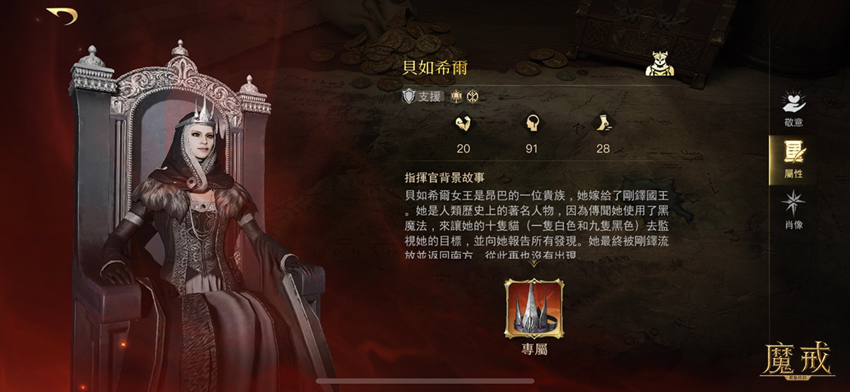 角色介紹:她曾是剛鐸的邪惡王后-貝如希爾,她戴上這頂頭飾,是為了時刻提醒自己曾是剛鐸的王后,並且要征服對這個對她避而遠之的王國,傳聞她使用黑魔法,讓她的十隻貓(一隻白色和九隻黑色)去監視她的目標,她最終被剛鐸流放並返回南方,從此再也沒有出現。