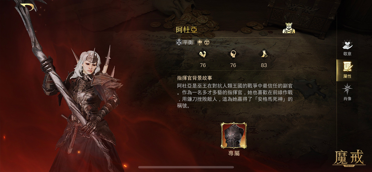 角色介紹:安格馬死神-阿杜亞,她擁有巨大的鐮刀以及冷酷的外表,是巫王在對抗人類王國的戰爭中最信任的副官,作為一名多才多藝的指揮官,她也喜歡在前線作戰,用鐮刀挫敗敵人,這為她贏得了「安格馬死神」的稱號。