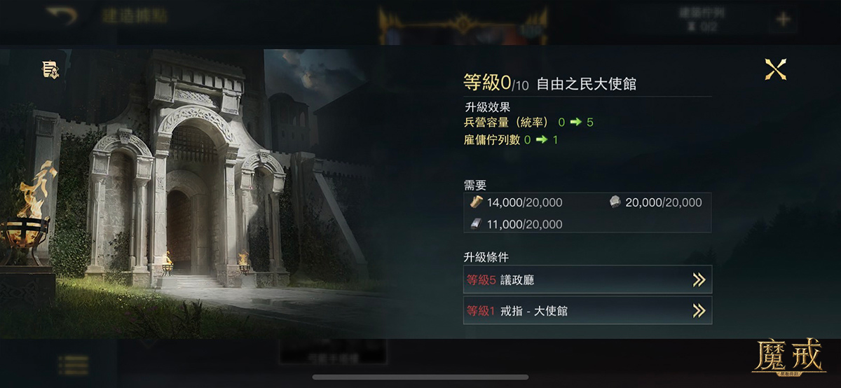 ‧ 大使館:在非 RP 伺服器裡可統馭對立陣營的兵種,但戰略家們需要先建立「大使館」,它能提升野外兵營的容量以及雇傭佇列。