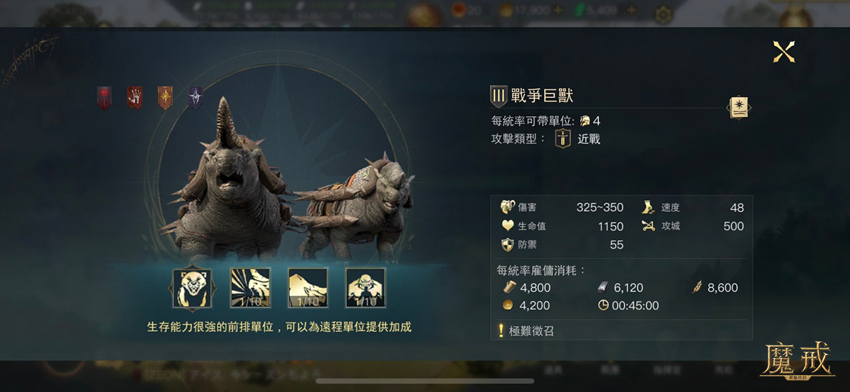 2.戰爭巨獸:生存能力很強的前排單位,可為遠程單位提供加成。
