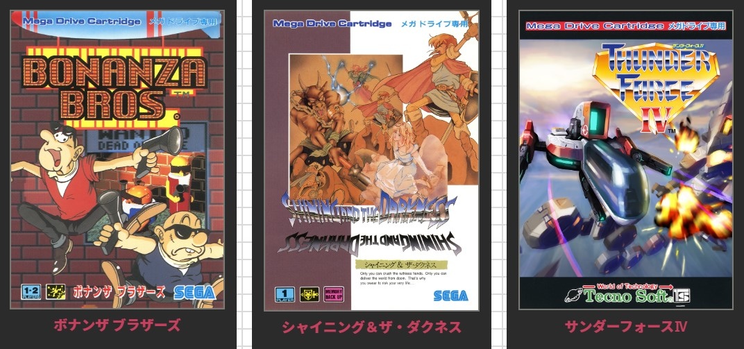 目前本作預定收錄的遊戲陣容方面,首波公開的項目包括有《Silpheed》、《Shining Force CD》(光明與黑暗CD)、《Sonic the Hedgehog CD》(音速小子CD)、《夢見館物語》、《Popful Mail》、《Virtua Racing》、《Bonanza Bros.》、《Shining & the Darkness》(光明與黑暗)、《Thunder Force IV》(閃電出擊4)、《Magical Taruruto》(神通小精靈)與《Fantasy Zone》,後續還將會陸續公開更多搭載同梱遊戲陣容,喜歡 MD 遊戲的玩家們可別錯過這次的收藏機會。