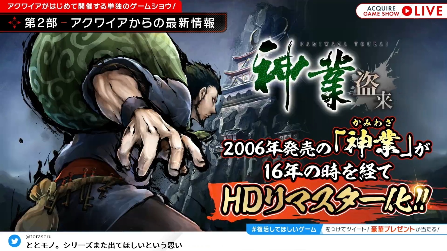 《神技盜來 -Kamiwaza Tourai-》為一款將 Acquire 於 2006 年在 PS2 主機上推出的人氣作《神技 -Kamiwaza-》(神業 -KAMIWAZA-)給重新移植復活的 HD 重製版。玩家在遊戲中,將飾演過去曾立志成為義賊的男人「海老三」,為了拯救受疾病所苦的女兒,而再度重新回歸義賊身分來展開冒險。在這次重製版中,除了提升整體畫質以實現更高解析度(Full HD)與更精細的貼圖外,也新增了自動保存功能、調整各種教學內容等,在保留原汁原味的原作氣氛同時,提供玩家們更佳的遊戲體驗。
