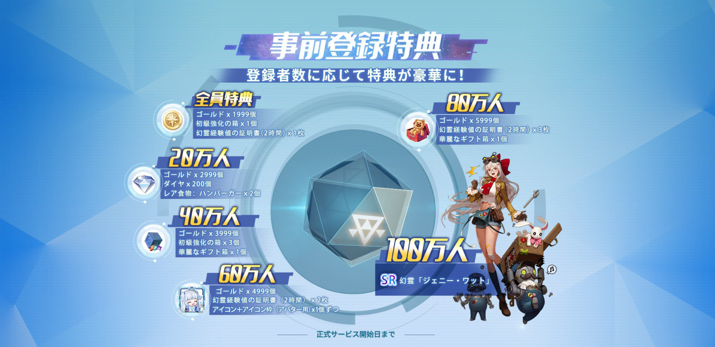而在日版目前進行中的預約註冊活動方面,將會贈送包括轉蛋用鑽石、可用來購買道具或強化裝備的金幣等典讓玩家們領取。一旦預約突破 100 萬人,還將會贈送 SR 幻靈「Jenny Watt 潔妮瓦特」讓玩家們領取使用,有興趣的玩家們可以趁現在先上官網確認。