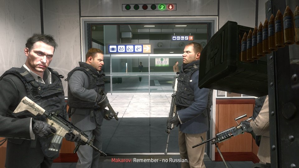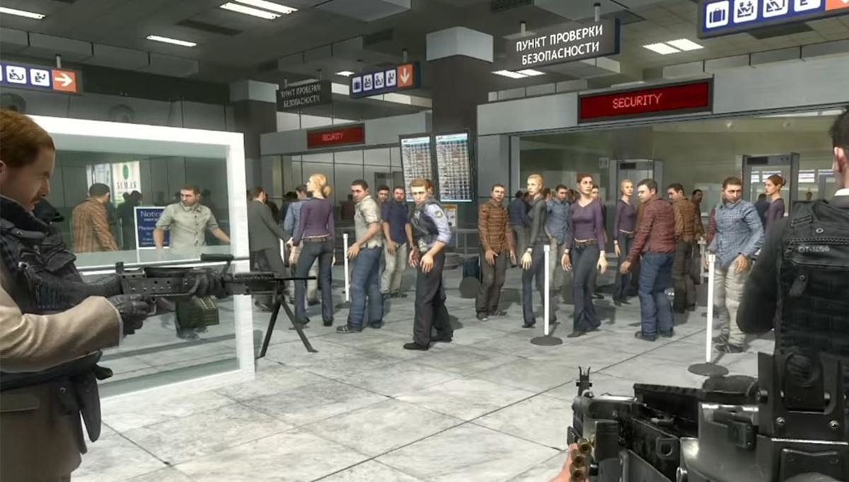 2009 年版《現代戰爭 2》戰役模式,其中一個名為「No Russian」的關卡中,玩家扮演臥底於恐怖組織中的 CIA 探員,為取得組織信任,必須與組織首腦和幾位同夥一同在俄羅斯機場展開一場無差別掃射恐攻,朝著大量手無寸鐵的平民開槍,試圖藉此引發戰爭,關卡名稱源自自反派馬卡洛夫在開場時對同夥講的一句「Remember, No Russian」。