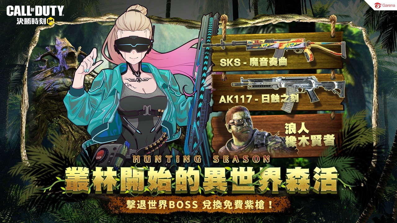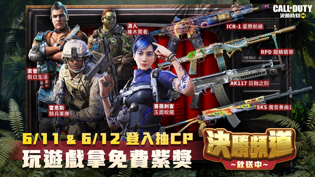 同時,官方也推出眾多活動:蒐集「叢林之箭」解鎖紫槍「SKS-魔音奏曲」,透過攻擊樹妖 Boss可獲得免費紫獎「AK117-日蝕之刻」、「浪人-橡木賢者」,期間共可獲得 4 把紫槍與 4 隻紫角,6 月 11 日與 6 月 12 日登入還有機會抽中 2000 CP,快與戰場大幫手共同登入作戰!