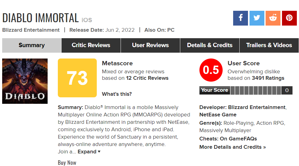遊戲也因為看似針對手遊情境與免費遊玩制的相關設計,與傳統《暗黑破壞神》玩家的期待有著激烈的衝突與爭議,《暗黑破壞神 永生不朽》 在《暗黑破壞神》系列中,還低於初期上市遭受重挫的《暗黑破壞神 3》,成為系列當中玩家評分最低的一款,也是暴雪旗下作品的新低標。雖然下載數突破千萬,作為要長期營運的 MMORPG 作品,後續的市場反應還有待觀察,目前《暗黑破壞神 永生不朽》已在台灣及中國與亞洲以外的地區推出,預計 6 月 23 日於台灣、中國、亞洲等地正式上線。