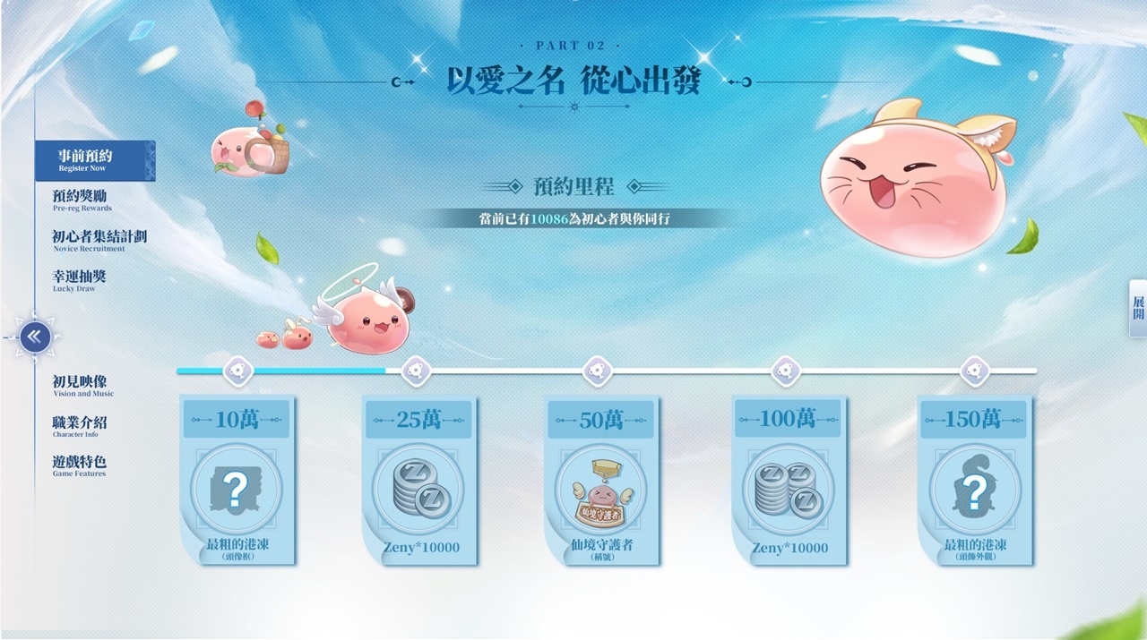 在《RO仙境傳說:愛如初見》正式上線之前,官方推出了獎勵豐富的預約里程碑活動,只為了和等待 20 年的冒險家們再次見面;預約人數滿十萬,全服即可獲得限定頭像框—最初的港凍。海量的 zeny 幣、限定稱號與頭飾外觀等著你來領取,千萬不要錯過了!