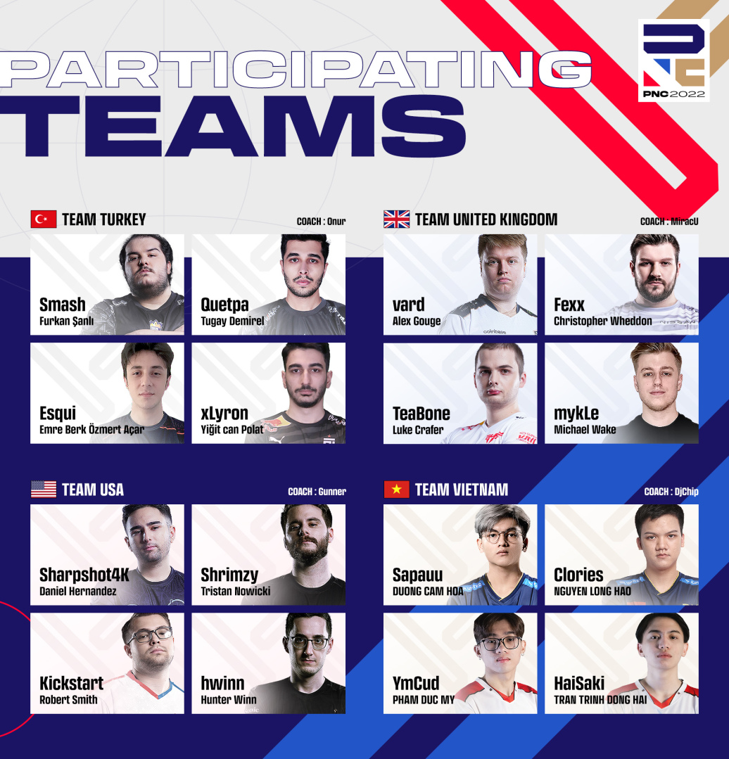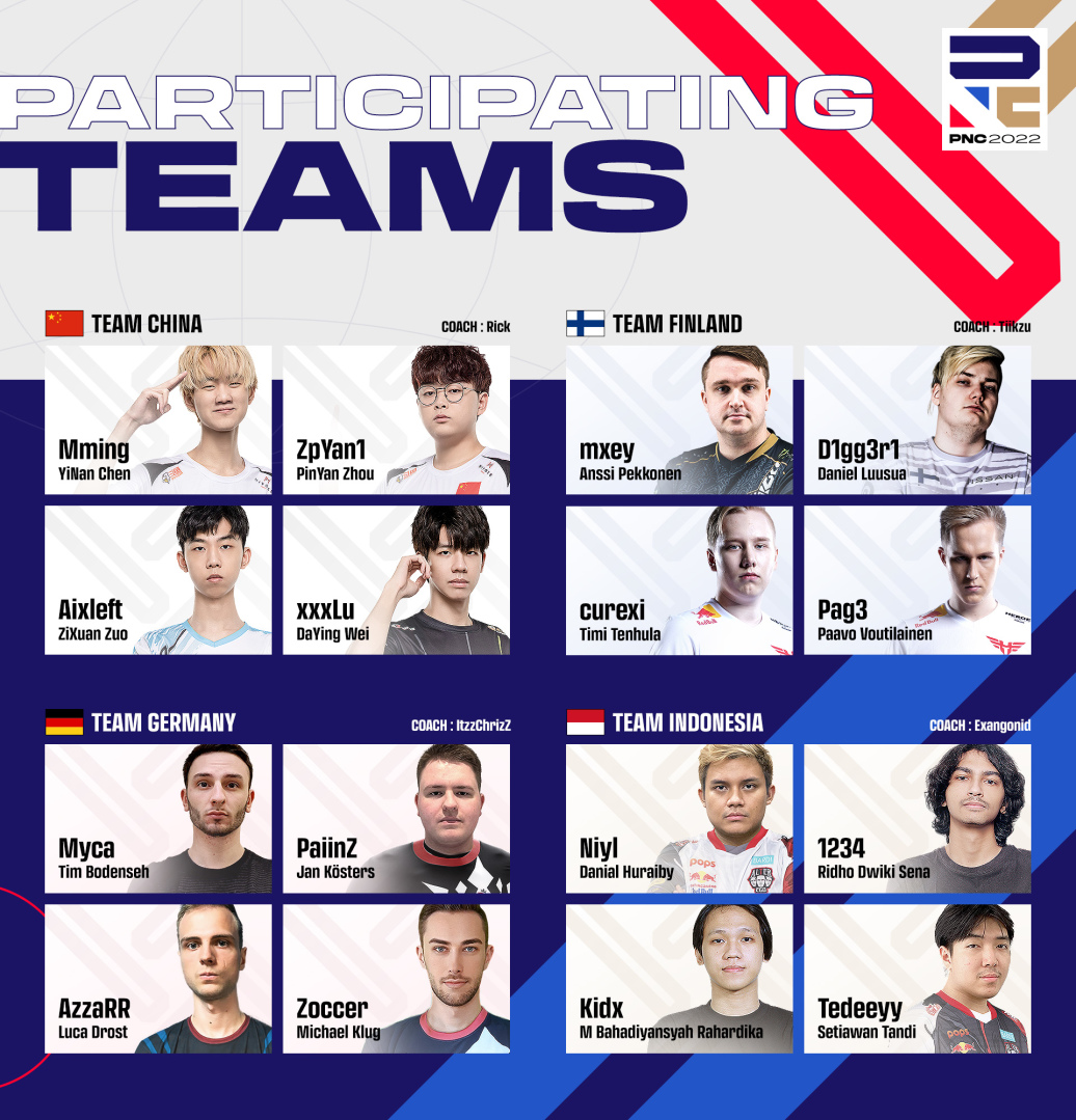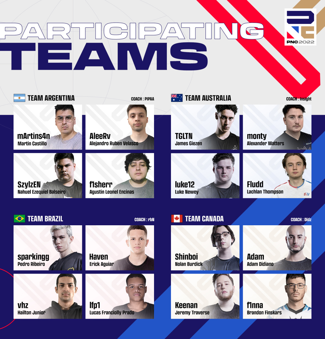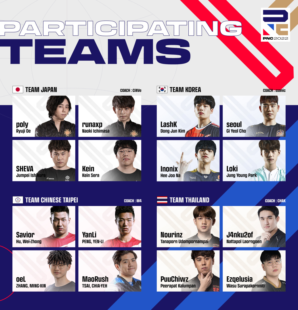 PNC 2022 每支代表隊由 4 名選手和 1 位教練組成,總計多達 80 位電競好手參賽。亞洲賽區有韓國、中國、日本以及台港澳地區等四支隊伍出戰;其中台港澳代表隊伍由 Global Esports Xsset (GEX) 的 Savior 和 YanLi、AOC 的 oeL,以及 Aura Esports (AE) 的 MaoRush 等四位人氣與實力兼具的選手組成,教練則是來自 GEX 的 M4 帶隊出征。