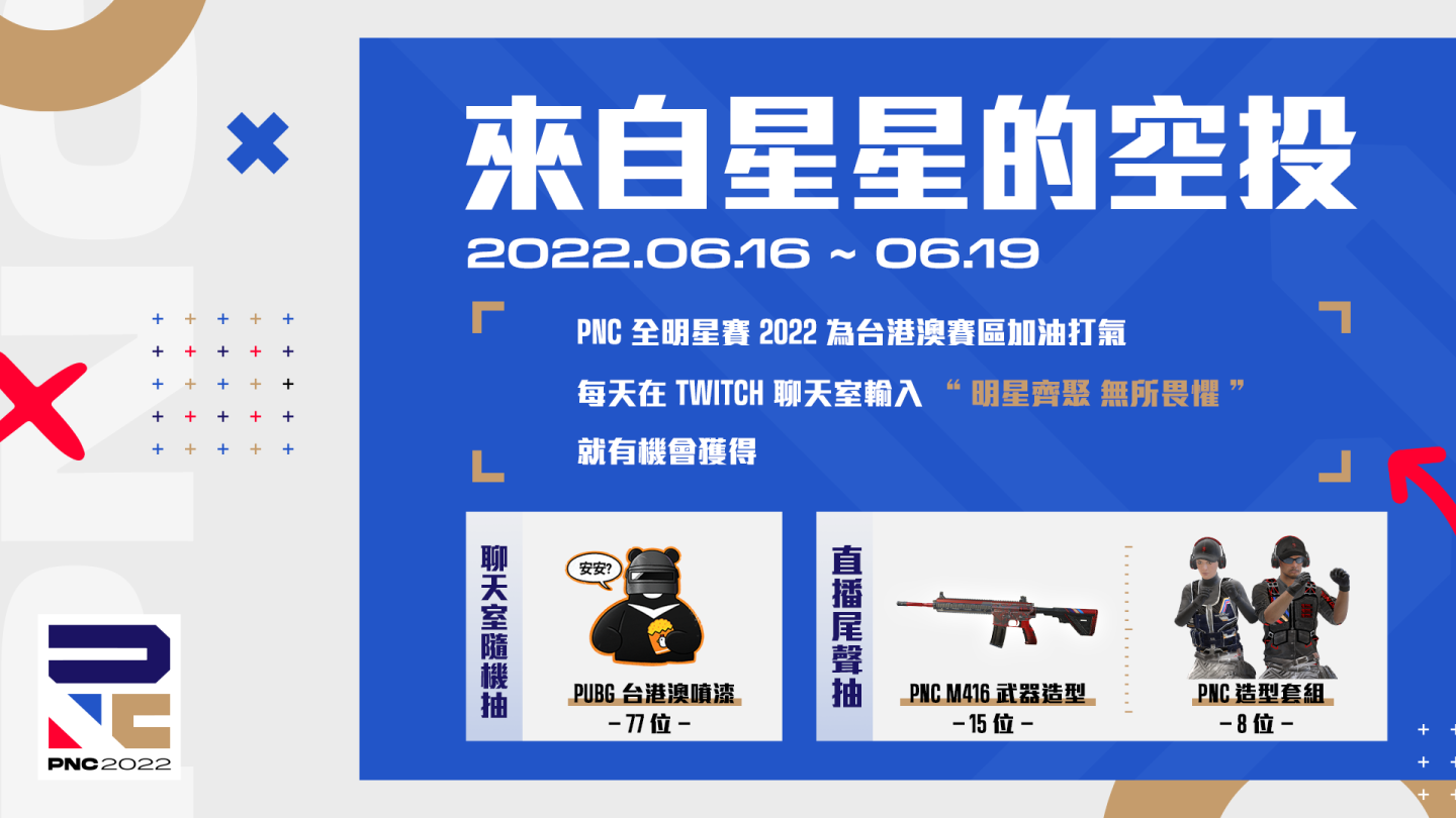 PNC 2022 全明星賽時隔三年後再次回歸,台港澳電競團隊為了彌補觀眾無法到現場的遺憾,特別舉辦了各種好康活動。比賽期間只要前往台港澳 Twitch 頻道觀看比賽,就有機會抽中 PNC 專屬的全造型禮包、M4 武器造型,以及首次出現的台港澳專屬噴漆等遊戲內獎勵,每天將抽出 100 名幸運得主!另外,現在只要前往官方臉書粉絲團參加「龜點我內行」,還能抽與選手同款的 PNC 迎賓禮盒,裡頭可是限量到不行的 PNC 主題周邊,無法親臨現場的電競迷們,別錯過收藏 PNC 2022 好物的難得機會!