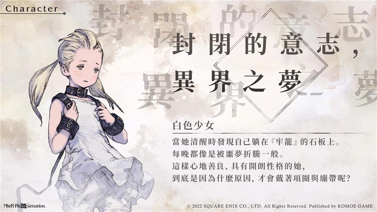 日本知名遊戲廠商 Square Enix 旗下《尼爾》系列首款手遊《NieR Re[in]carnation》(中文名《尼爾:重生》)事前預約活動進行中,至今已累積突破 10 萬預約人數。本作由創意總監「橫尾太郎」等原班製作人馬以最高規格打造了全新的故事,官方首度公開遊戲內「牢籠」概念 PV 與主角設定,讓玩家搶先一窺牢籠世界的神秘面紗。現已成功解鎖獎勵「100 個寶石」,當所有目標達成後,可獲得免費的 4500 個寶石(相當於 15 次轉蛋)、3 張高級轉蛋券與大量養成素材獎勵。