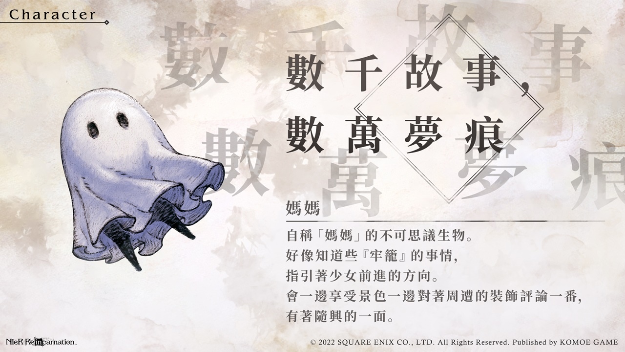 陪伴在主角身邊的「媽媽」,不可思議生物。好像知道些『牢籠』的事情,指引著少女前進的方向。