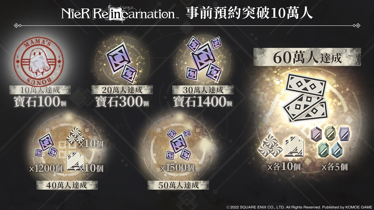 目前《NieR Re[in]carnation》預約已突破 10 萬人,感謝玩家對此遊戲的期待與對系列作的熱誠!現已成功解鎖獎勵「100 個寶石」,當所有目標達成後,總計還能獲得免費 4500 個寶石(相當於15次轉蛋)、3張高級轉蛋券與大量養成素材獎勵!