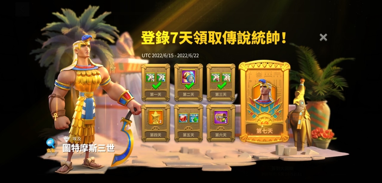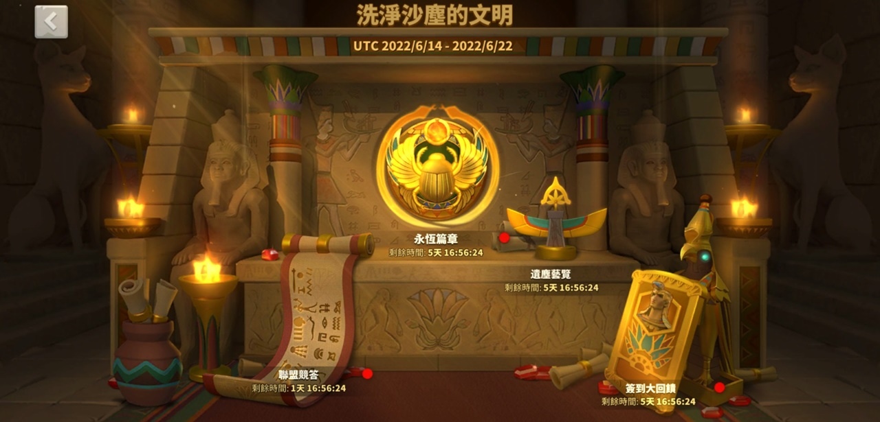 本次大改版舉行埃及主題福利活動「洗淨沙塵的文明」!透過「永恆篇章」,玩家可以跟隨吉爾伽美什,探索神祕埃及文明,尋找永恆的真諦。觀賞精彩敘事劇情,即可獲得限定頭像框與豐富道具好禮。別忘了每天至「簽到大回饋」完成簽到,就有埃及傳說統帥「圖特摩斯三世」與多重獎勵送給你。除此之外,還有趣味問答活動「聯盟競答」,與盟友一同回答問題,累積聯盟得分,解鎖更豐厚的獎勵吧!