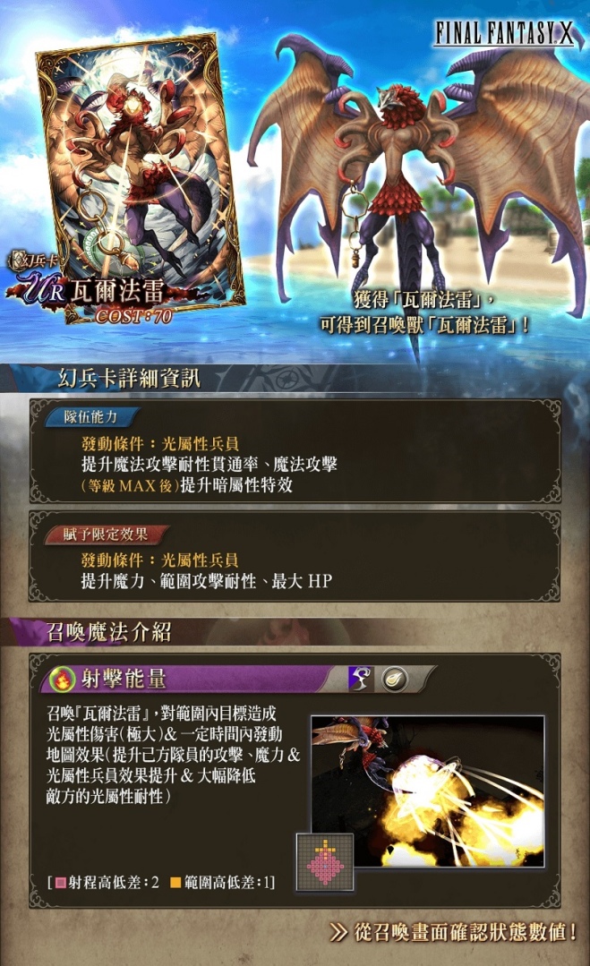 透過期間限定的精選召喚,您還有機會獲得稀有度UR幻兵卡「瓦爾法雷」,於獲得幻兵卡的同時,還可得到稀有的召喚獸「瓦爾法雷」!幻兵卡「射擊能量」對範圍內目標造成光屬性傷害(極大)&一定時間內發動地圖效果(提升己方隊員的攻擊、魔力&光屬性兵員效果提升&大幅降低敵方的光屬性耐性)。