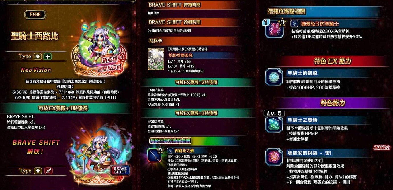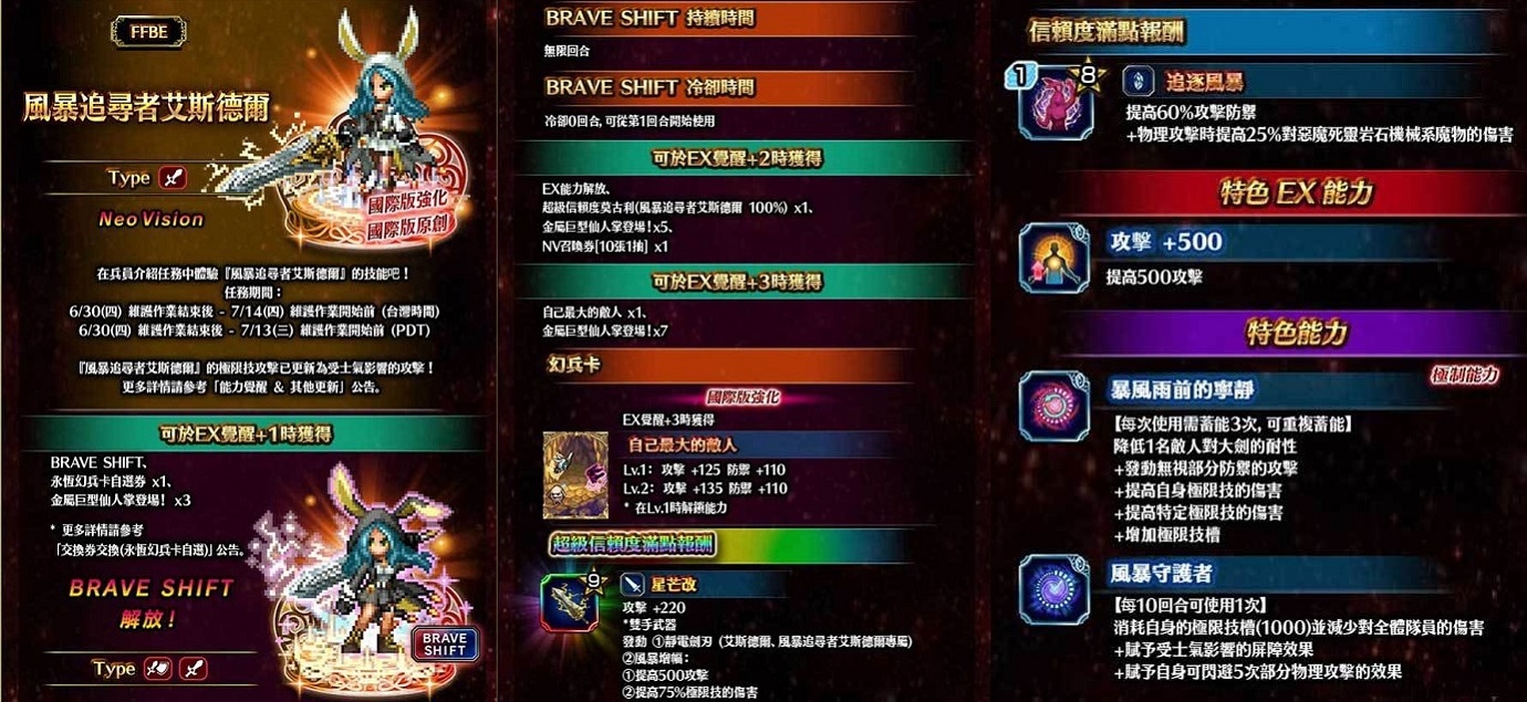 擁有全新的華麗極限技動畫,來自「基本力量」的新國際版NV兵員『威爾克』與『聖騎士西路比』已經踏上冒險的征途。於活動期間您將可透過精選召喚,邀請他們與你一同戰鬥。此外廣受玩家喜愛的NV兵員『風暴追尋者艾斯德爾』出現機率獲得提升。她的極限技也獲得提升。提升對全體敵人發動受士氣影響的攻擊,玩家在「意志對決」的戰鬥中,將可造成更多的傷害。