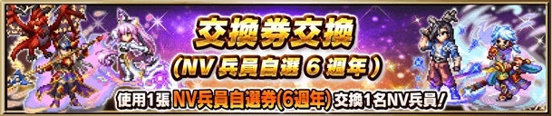 ‧「NV兵員自選券(6週年)」:即日起至 7/21 活動時間結束止,玩家可於「6週年登入獎勵」活動中,獲得 1 張「NV兵員自選券(6週年)」。於交換商店中指定的 78 名 NV 兵員中,玩家可自選交換 1 名最喜歡的強大兵員,比如兵員『潮汐召喚者海斗』。