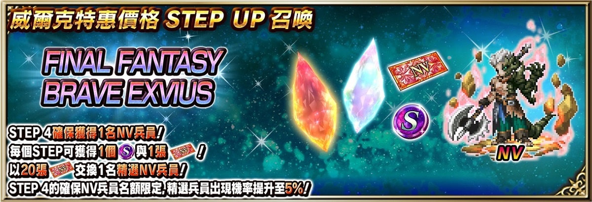 ‧『威爾克』特惠價格STEP UP召喚:即日起至 8/4 活動時間結束止,玩家可於 STEP 4 確保獲得 1 名 NV 兵員。此外於 STEP 1 至 STEP 4,玩家能以特惠的寶石價格進行召喚。