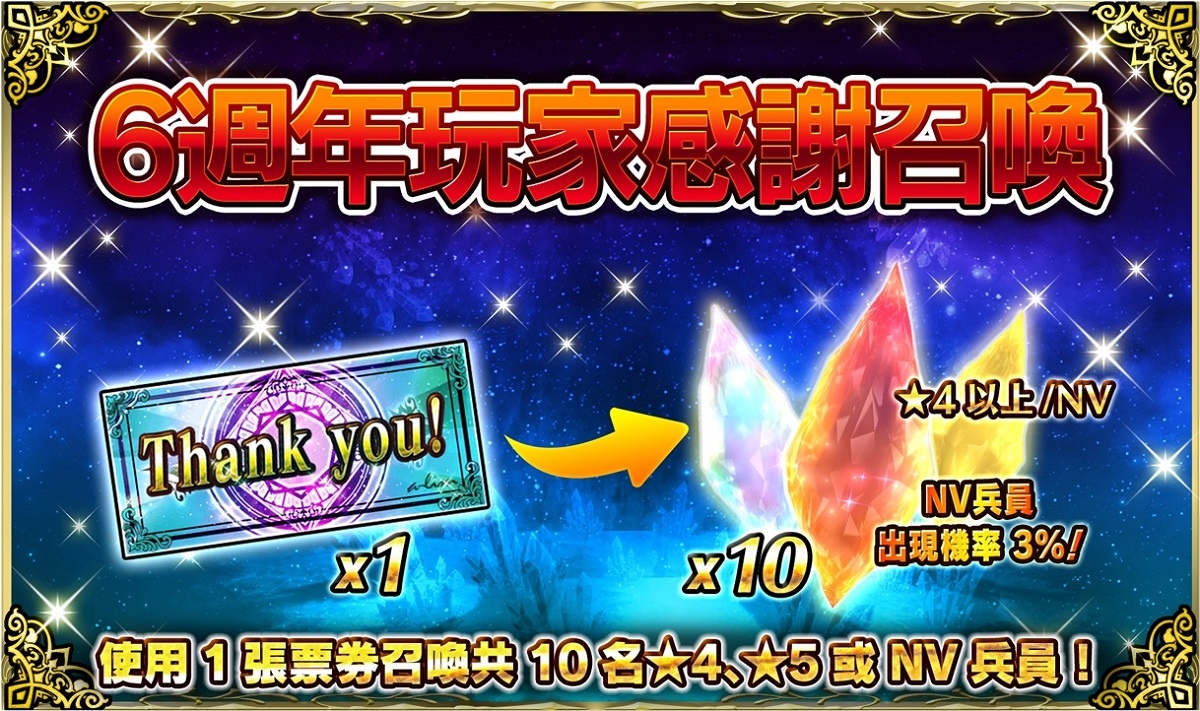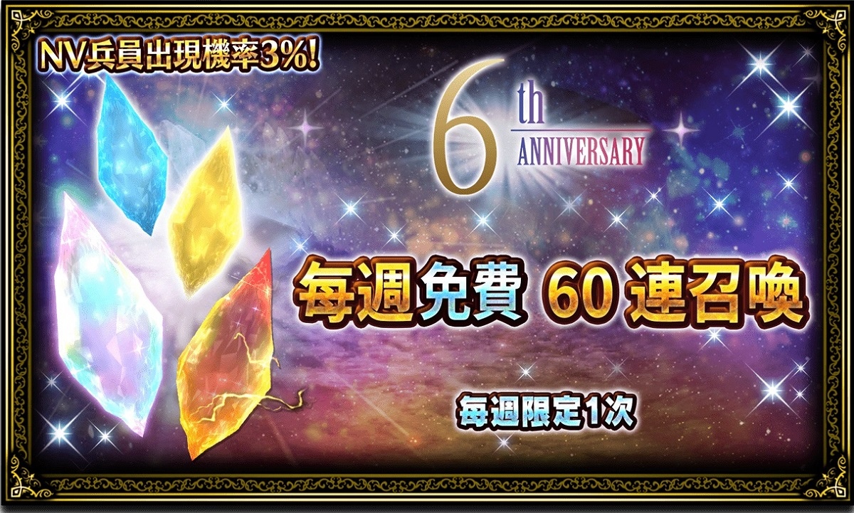 ‧「6週年每週免費60連召喚」:於活動期間,玩家在8週內,可每週進行1次免費60連召喚,最多可獲得 480 連召喚。每週將會於召喚池內加入新的特定兵員,最後一波將加入 8/18 活動時間起至 9/8 活動結束止的新特定兵員。