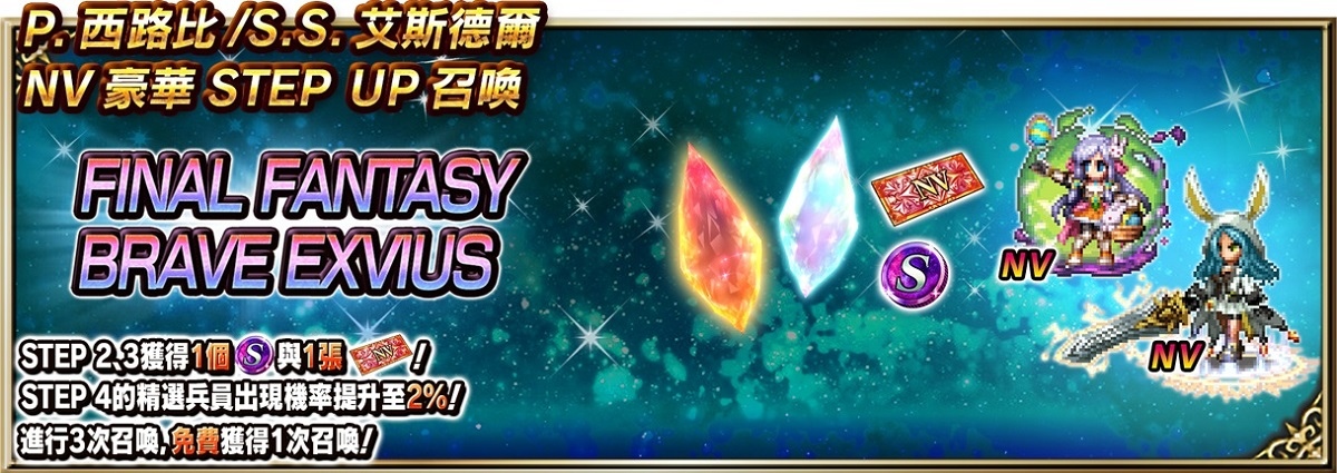 ‧『P.西路比/S.S.艾斯德爾』NV 豪華 STEP UP 召喚:即日起至 7/14 活動時間結束止,玩家可於 STEP 2、3 召喚獲得 1 個「召喚硬幣(P.西路比/S.S.艾斯德爾)」與1張「NV交換券(P.西路比/S.S.艾斯德爾)」。此外,當玩家們完成 STEP 1 至 3 召喚,將可免費進行 STEP 4 召喚。