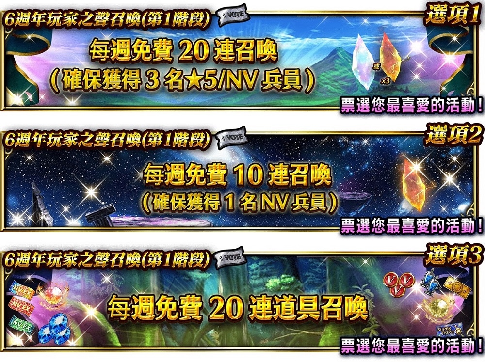 「6週年玩家之聲召喚(第1階段)」3個活動選項