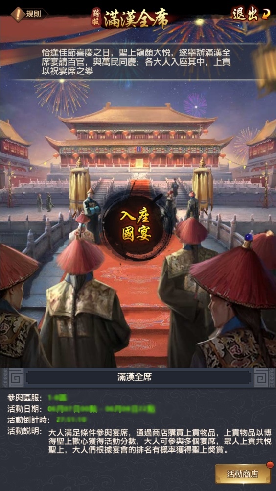 五週年特別慶典活動「滿漢全席」即將開啟,金樽清酒鬥十千,玉盤珍羞直萬錢,所有玩家們都可以跨服參與盛宴,共飲美酒,在宴會結束後還有機會獲得聖上的獎賞!