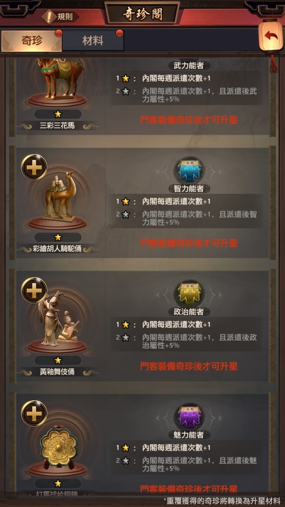 祥雲瑞彩萬裏錦,奇珍異寶現皇城!本次更新後新增「三彩三花馬」、「彩繪胡人騎駝俑」、「黃釉舞伎俑」等五大奇珍,奇珍擁有強大的功能,任意門客裝備後都可增加每週內閣派遣次數,並根據奇珍等級在派遣事件中獲得對應類型的屬性加成,助仕途更上一層樓!
