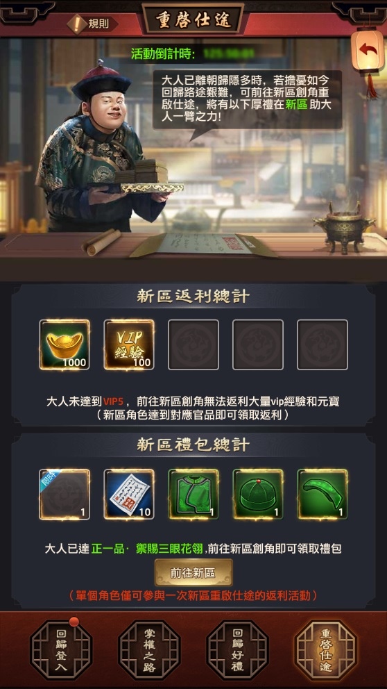 「重歸仕途」活動新增「重啟仕途」功能,玩家可前往新區創建角色,系統將依據過往擁有的 VIP 級別和官品等級發送重啟仕途返利,每個角色都有一次機會可領取返利!此外,官方也將於 7 月 11 日起推出 MyCard 儲值活動,全通路購買不限面額 MyCard 點數儲值即享優惠回饋,詳情請見遊戲官網。